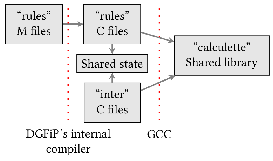 Ce dernier point sur le calcul des dépendances éclaire aussi pourquoi la DGFiP a choisi un langage dédié externe, avec sa propre syntaxe et compilateur, plutôt qu’un langage dédié embarqué à l’intérieur de C, à base de macros du pré-processeur qui émulent la syntaxe du M. Aussi puissantes que soient les macros du pré-processeur C, elles ne permettent pas de calculer l’ordre topologique d’un graphe de dépendance. Pour cela, un véritable compilateur est requis.
